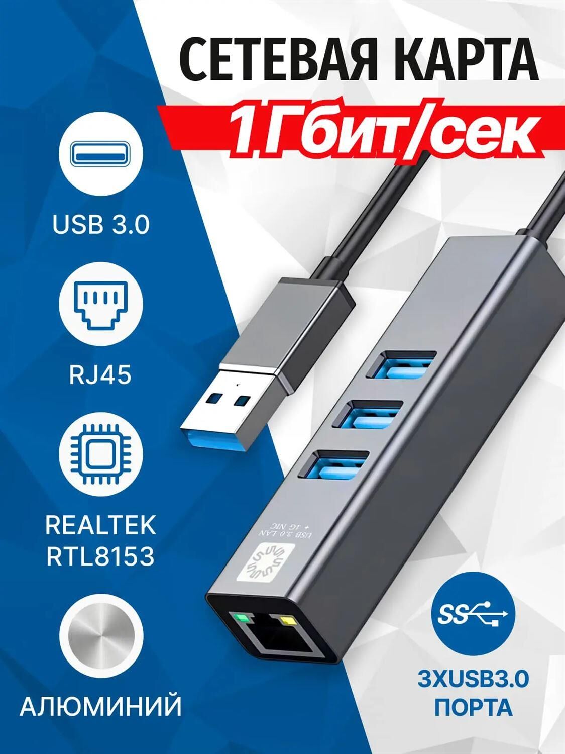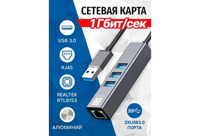 Сетевая карта 5bites UA3-45-11BK - компактное устройство, которое выполняет роль переходника и подключает ваш Ethernet-кабель к портативному компьютеру через USB порт. А так же добавляет три порта USB 3.0 в вашу систему. • Разъемы: USB AM -> RJ45 гнездо + 3*USB3.0 порта • Интерфейс: USB1.0/1.1/2.0/3.0 • Длина кабеля (см): 15 • Стандарт связи: IEEE 802.3 10 / 100 / 1000 base-t • Скорость передачи данных: 10 / 100 / 1000 Мбит/с (full duplex) • Питание (В): от USB порта • Чипсет: GL3510 + Realtek RTL8153 • Предназначение: добавляет в систему порт RJ45 и 3*USB3.0 порта • Поддержка ОС: WINDOWS XP/VISTA/WIN7/8/10 32 и 64bit, Linux, Android 1.x/2.x/3.x/4.x, MAC OS10.4 • Цвет: серый • Материал корпуса: алюминий