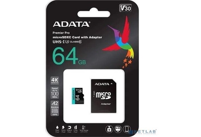 [Карта памяти ] Micro SecureDigital 64GB A-Data AUSDX64GUI3V30SA2-RA1 Premier Pro + adapter Class10