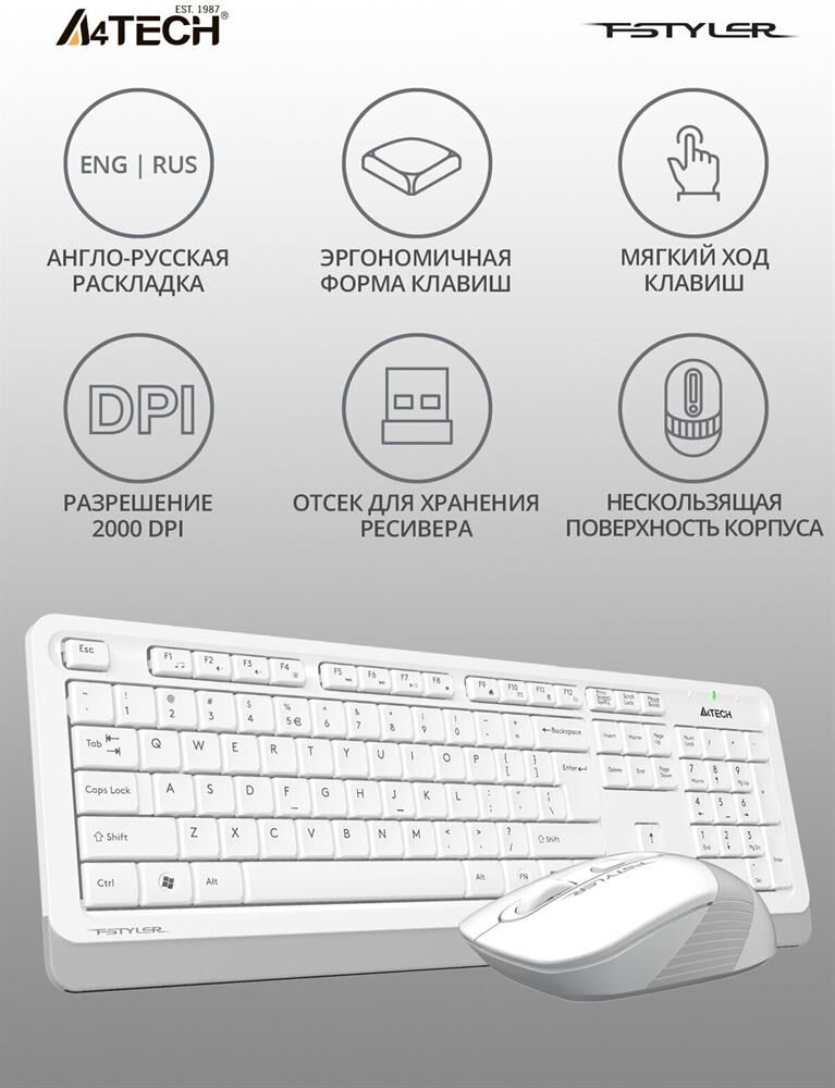 A4TECH Комплект (клавиатура+мышь) Fstyler FG1010, USB, беспроводной, белый [fg1010 white]