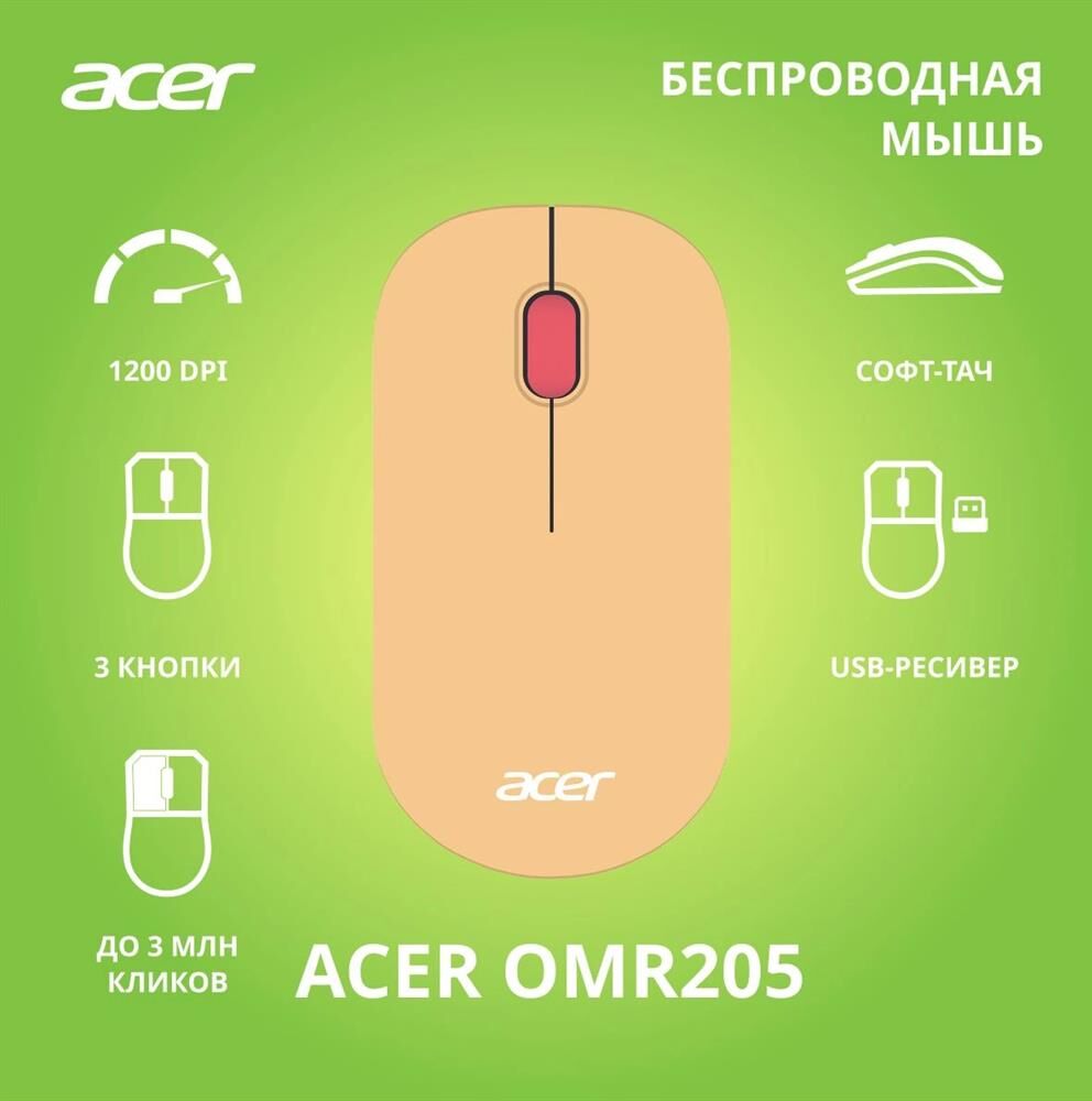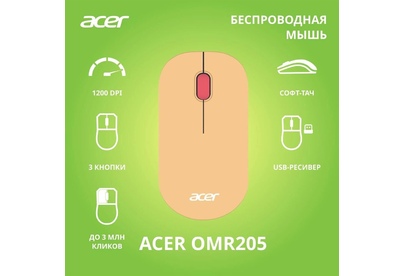 ACER Мышь беспроводная OMR205, радио, оптическая, USB, 1200dpi, розовый и бежевый [zl.mceee.02l]