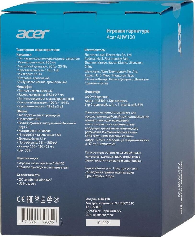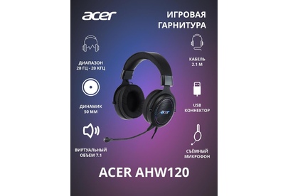 ACER Наушники с микрофоном AHW120 черный 2.1м мониторные USB оголовье (ZL.HDSCC.01C)