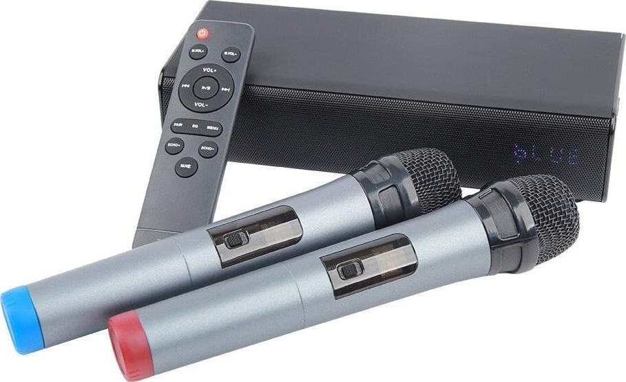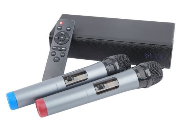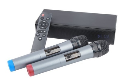 Выходная мощность (RMS): 20 Вт (стерео), Пиковая мощность: 100Вт, Тип аккумуляторной батареи: литий-полимерный (3,7В / 4000мАч), Время зарядки аккумуляторной батареи: 3 часа (при 5В / 1A), Время работы от аккумуляторной батареи: до 5 часов (зависит от громкости и аудио-контента), Источник постоянного тока: 5В / 1А, Эффективный рабочий диапазон частот: 45 Гц - 20 кГц, Диаметр динамиков: 2" (5см) x 2, Соотношение сигнал-шум: >90дБ, Версия Bluetooth 5.0 + EDR, A2DP, AVRCP, Радиус действия Bluetooth: до 10 м, Дальность действия микрофонов: до 40 метров. Размеры устройства: 250*95*60мм, Рабочая температура: от -5 до +60 °C, Вес: 0,95кг, Универсальный караоке-саундбар представляет собой коммутационно-усилительный блок с модулями преобразования и обработки звуковой информации, позволяющий осуществлять функцию караоке с двух беспроводных радиомикрофонов. Система оснащена функцией Bluetooth колонки номинальной мощностью 20 Вт (10Вт*2).