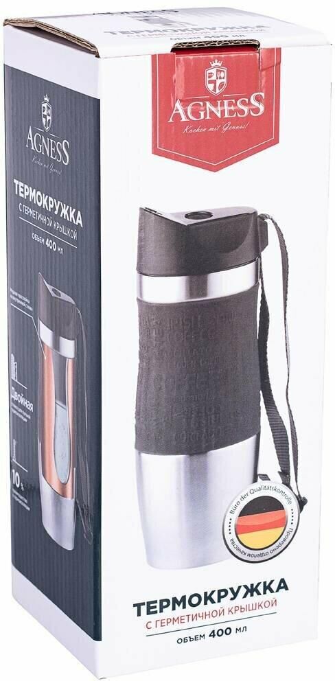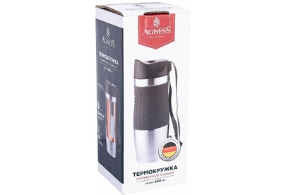 Термокружка AGNESS - Ваш незаменимый помощник в повседневной жизни Будь это дальняя поездка, обычная прогулка или просто рабочий день в офисе - любимый напиток всегда с собой. Двойные стенки из нержавеющей стали, благодаря технологии вакуумной термоизоляции, сохраняют напитки холодными или горячими в течение долгого времени. Дополнительная медная прослойкой между 2-мя стенками, увеличивает термоизоляцию на 10%. Герметичная крышка с кнопкой-стоппером. Используя кнопку стоппер Вы легко можете открыть термокружку одной рукой, что особенно удобно в дороге. Термокружку AGNESS удобно брать с собой, она легко поместиться в сумку или рюкзак.