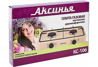 АКСИНЬЯ КС-106 бежевая Параметры Номинальная тепловая мощность 2,2х2 кВт Номинальный расход газа 320 г/ч Номинальное давление используемого газа 3,0 кПа Вид сжиженного газа пропан/бутан Количество конфорок 2 конфорки Тип настольная Тип розжига ручной Максимальная нагрузка на конфорку 10 кг Описание Предназначена для приготовления и разогрева пищи в бытовых условиях, только с бытовыми газовыми баллонами Покрытие из термостойкой эмали Цвет эмали: бежевый Поворотный механический регулятор пламени конфорки Возможность присоединения газового шланга с двух сторон Прибор предназначен для работы только на сжиженном газе с бытовыми газовыми баллонами объемом 5 л, 12 л, 27 л или 50 л (в комплект поставки не входит) Подсоединение газовой плиты к газовому баллону должно осуществляться при помощи регулятора давления газа (редуктора), резинового шланга и хомута ВНИМАНИЕ! Запрещено подключать баллон с газом напрямую к плите без регулятора давления газа (редуктора)! Газовый шланг, регулятор давления газа (р