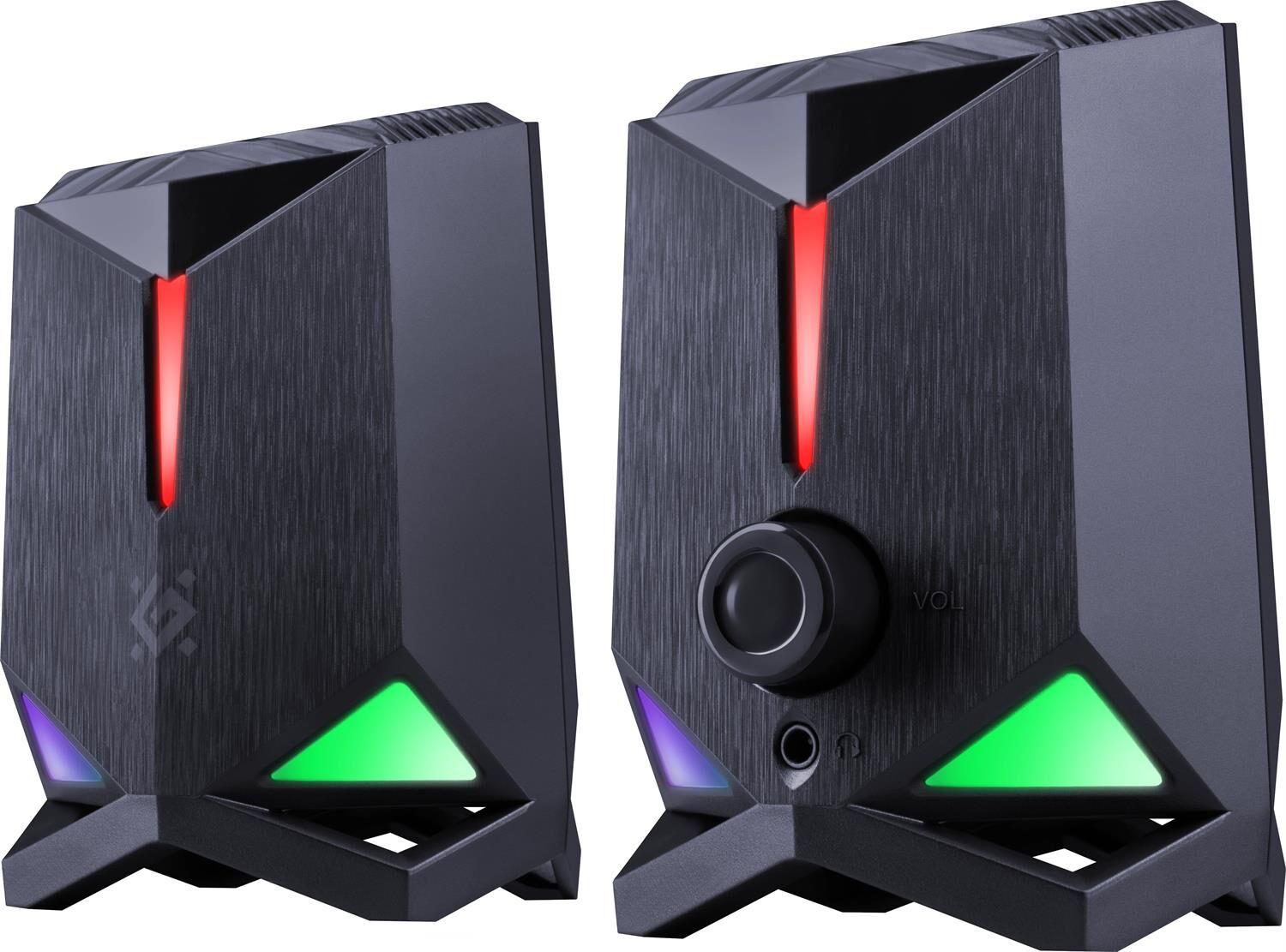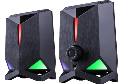 Геймерские компьютерные колонки со светодиодной подсветкой. На передней панели расположен регулятор громкости со встроенным выключателем и разъем для подключения наушников.