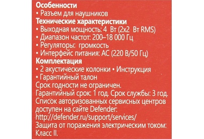 4 Вт, диапазон частот 200 - 18000 Гц, разъем для наушников, с питанием от сети 220В