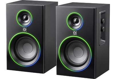 Геймерские компьютерные колонки в деревянном корпусе со светодиодной подсветкой и с функцией Bluetooth. На боковой панели расположен регулятор громкости со встроенным выключателем питания, разъем для подключения наушников, кнопка управления режимами подсветки и переключения AUX/Bluetooth и регулировка тембра низких частот.