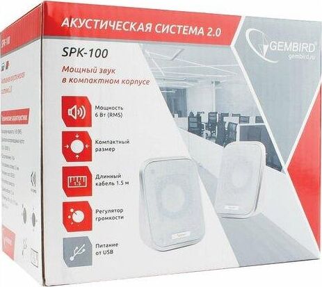 Акустическая система, мощность 6 Вт (RMS), диапазон воспроизводимых частот: 120 - 20 000 Гц, сопротивление: 4 Ом, тип разъема: штекер 3.5 мм, регулятор громкости, питание от USB, длина кабеля: 1.5 м