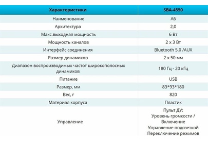 Макс.выходный мощность 6 Вт Мощность каналов 2 x 3 Вт Интерфейс соединения Bluetooth 5.0 /AUX Размер динамиков 2 х 50 мм Диапазон воспроизводимых частот широкополосных динамиков 180 Гц - 20 кГц Питание USB Размер, мм 83*93*180 Вес, г 820 Мате