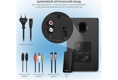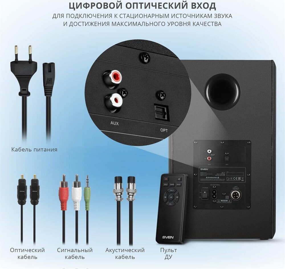 компьютерная акустика SVEN MC-30, сигнальный кабель 2RCA к mini-jack, оптический кабель, кабель питания, акустический кабель, пду, руководство по эксплуатации, гарантийный талон