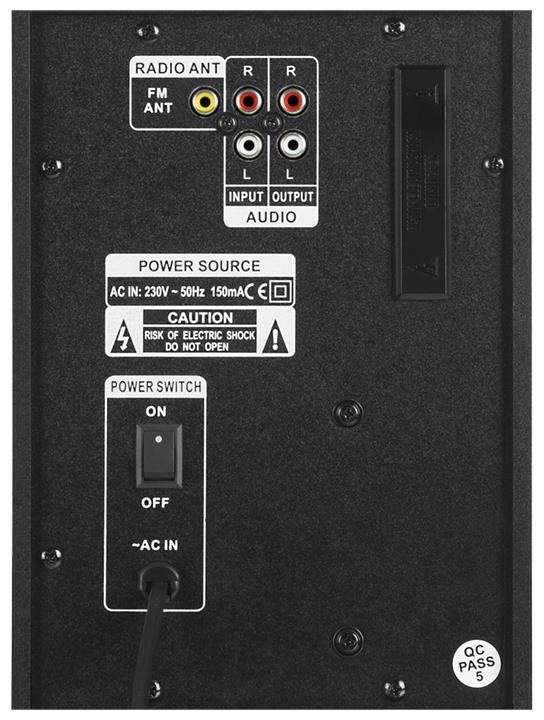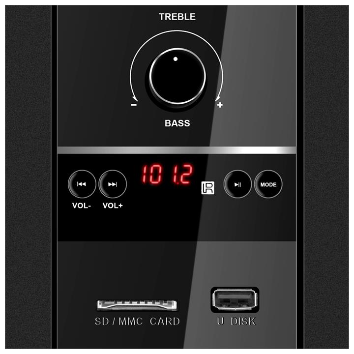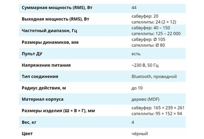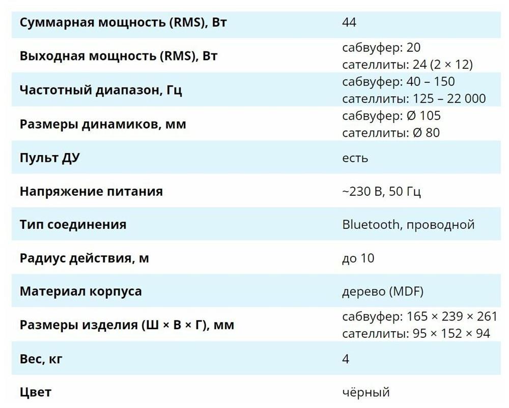 Выходная мощность (RMS), Вт: сабвуфер: 18/сателлиты: 22 (2х11), Частотный диапазон, Гц: сабвуфер: 40–150 / сателлиты: 150–20 000, Размеры динамиков, мм: сабвуфер: 105 / сателлиты: 80, Пульт ДУ, Напряжение питания: ~230 В, 50 Гц, Тип соединения: Bluetooth, проводной, Радиус действия, м: до 10, Материал корпуса: дерево (MDF), Суммарная мощность (RMS), Вт: 40.