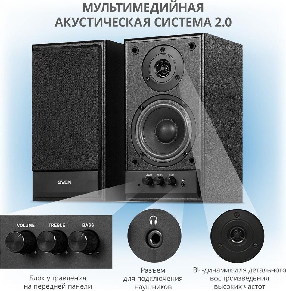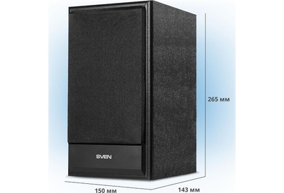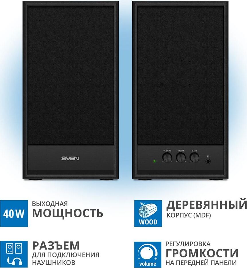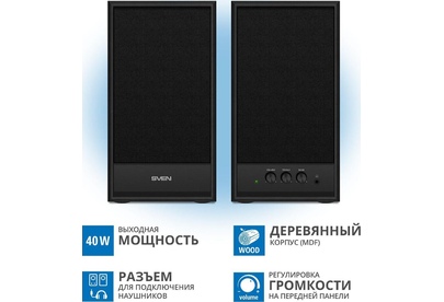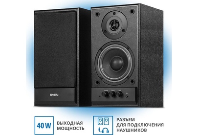 Акустическая система, выходная мощность (RMS), Вт 40 (2 х20), частотный диапазон, Гц 40 – 22 000, диаметр ВЧ-динамиков, мм O 19, диаметр НЧ-динамиков, мм O 100, напряжение питания ~220 В, 50 Гц, материал корпуса - дерево (MDF), встроенный трансформаторный источник питания, управление настройками - на передней панели, размеры изделия, мм - 143х265 х150.