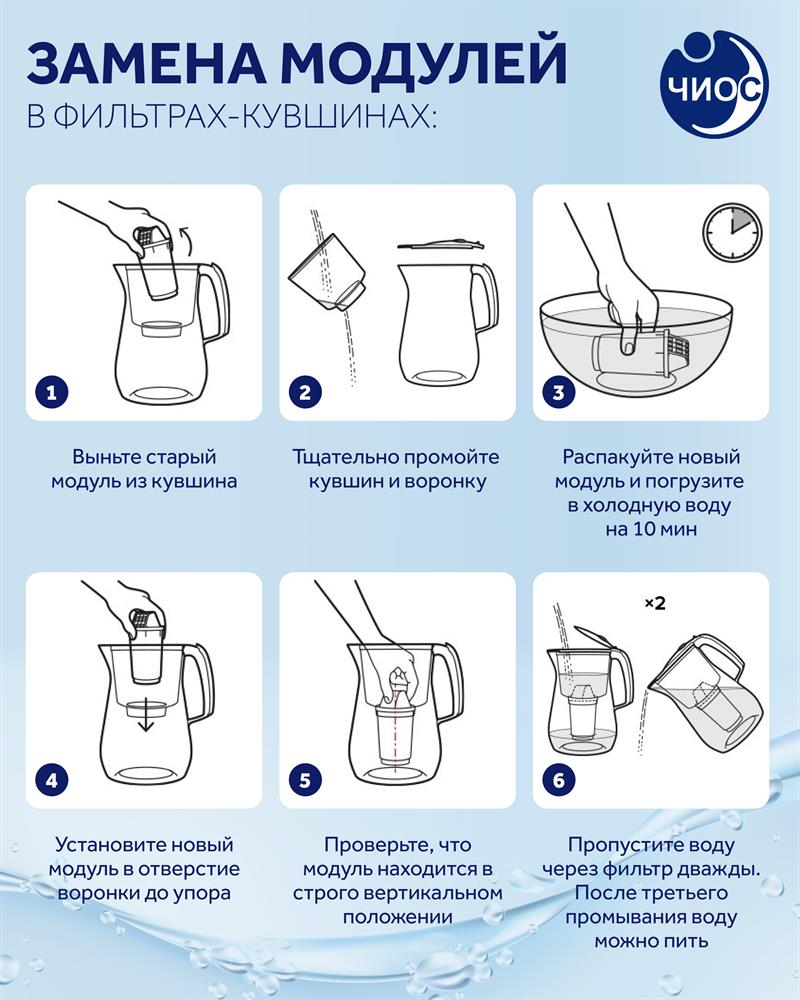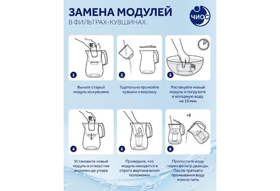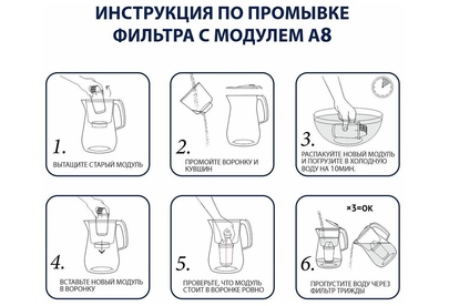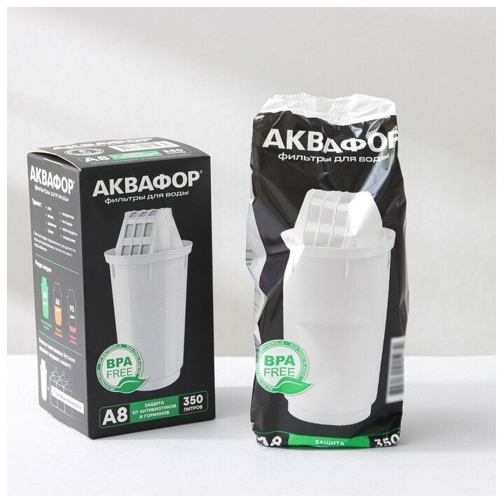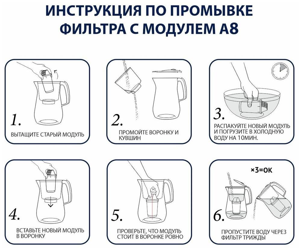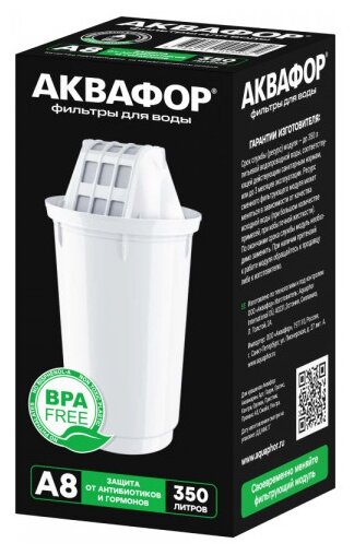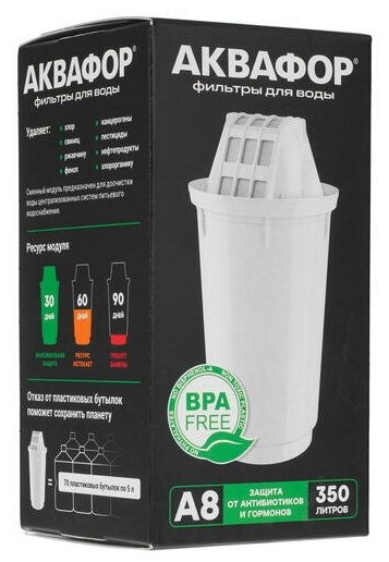Сменный картридж для кувшина. Глубокая фильтрация от растворенных химических примесей, включая гормоны и антибиотик. чистит воду от самых распространенных примесей, включая хлор, органические соединения (в т. ч. фенолы), тяжелые металлы, ржавчину, остатки лекарственных средств. онструкция кувшинного модуля A8 позволяет ему самоочищаться каждый раз, когда вы набираете новую порцию воды в воронку, поэтому модуль не придется менять слишком часто. Ресурс модуля составляет 350 литров, модуль может прослужить до трех месяцев в зависимости от количества человек в семье.