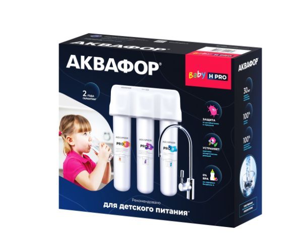 Умягчающая система Baby Н Pro включает инновационный модуль предочистки и сорбции 2 в 1, ионообменный блок для снижения скорости образования накипи и дополнительный сорбционный модуль для глубокой очистки воды от техногенных загрязнений. Скорость фильтрации 2 л/мин. Ресурс 8000 л. Система удаляет активный хлор, тяжелые металлы, пестициды, нефтепродукты, а также антибиотики, гормоны, радионуклиды и свободные радикалы, даже если вода ржавая или мутная. Система была протестирована на способность удалять остаточные количества фармпрепаратов на примере антибиотика Левомицетина и стероидного гормона Эстрона с результатом фильтрации 99,9% и 99.8% соответственно.