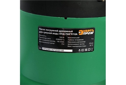 Мощность, Вт: 750. Параметры сети: 220В/ 50Гц. Максимальный расход воды л/ч: 12500. Max высота подачи воды м: 8. Глубина всасывания , м: 7. Максимальный размер пропускаемых частиц, мм:35. Макс.температура воды, ◦С: 35.