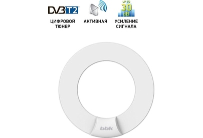 Активная комнатная антенна, для цифровых телевизионных сигналов DVB-T, DVB-T2, принимаемый диапазон: VHF, UHF, Коэффициент усиления до 30дБ, источник питания - коаксиальный кабель или адаптер питания