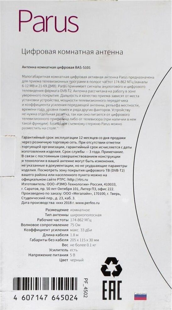 Антенна телевизионная комнатная PERFEO PARUS (BAS-5101) DVB-T2 активная, встр. усилитель