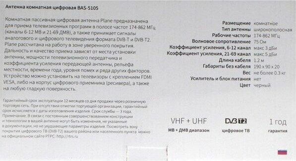Антенна комнатная цифровая PF-TV3214 «PLANE» предназначена для приема телевизионных программ в полосе частот 174..862 МГц, а также принимает сигналы аналогового и цифрового телевидения формата DVB-T и DVB-T2. Обеспечивает прием сигналов телевидения в зоне уверенного приема Устанавливается на телевизоры с креплением FDMI VESA, корпус цифрового приемника (ресивера), на окно или любую подходящую поверхность с помощью специального адгезивного слоя