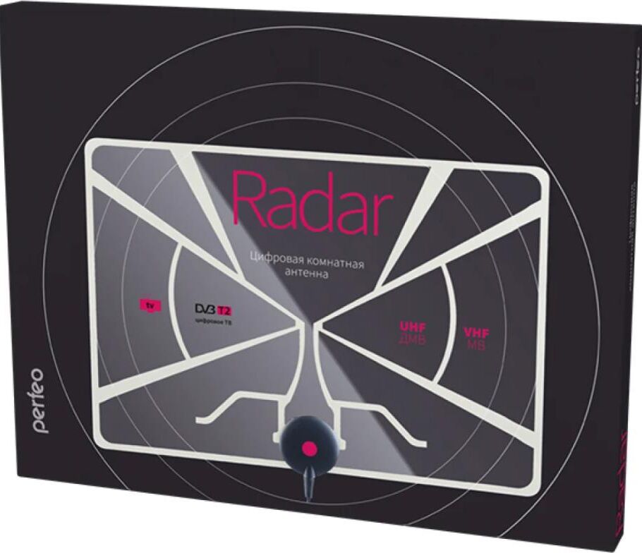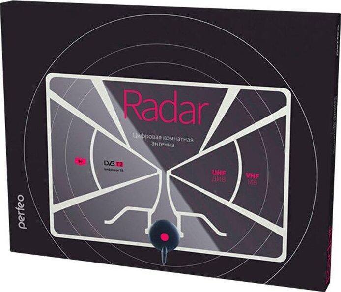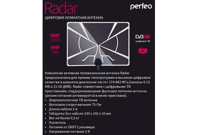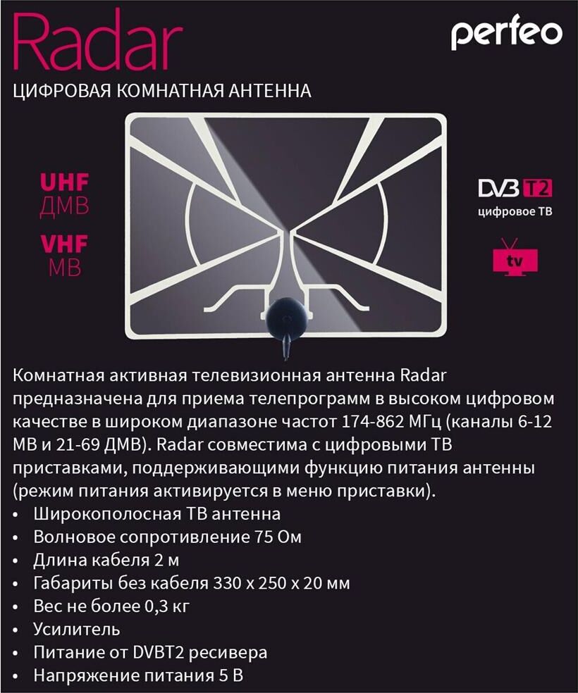 Антенна телевизионная комнатная PERFEO RADAR (BAS-5324) активная, встр. усилитель, питание от ресивера 5V, DVB-T2