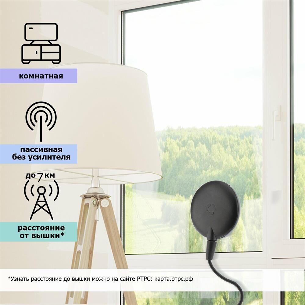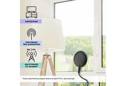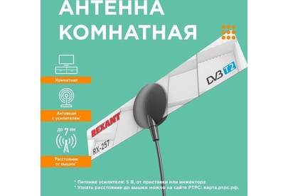Антенна комнатной установки, предназначена для приема цифрового эфирного ТВ вещания в стандарте DVB-T2. Использутся для приема цифрового эфирного вещания на телевизорах или комбинированных ресиверах, укомплектованных тюнером стандарта DVB-T2. Характеристики: - Установка антенны: комнатная; - Назначение: для приёма цифрового эфирного ТВ вещания; - Коэффициент усиления: 3 дБи; - Волновое сопротивление: 75 Ом; - Дальность установки от БС: до 7 км; - Кабель: 1,2 м; - Тип подкл: ТВ штекер; - Усилитель: нет; - Масса: 0,1 кг; - Размеры в сборе: 210х40х20 мм; - Тип упаковки: коробка с держателем; - В комплекте: антенна, крепление (присоски), руководство пользователя Дополнительная информация: Посмотреть зону покрытия цифрового ТВ (DVB-T2), или определить удаленность Базовой Станции (телецентра) от вашего района или населенного пункта можно на официальном сайте РТРС: http: //карта.ртрс.рф