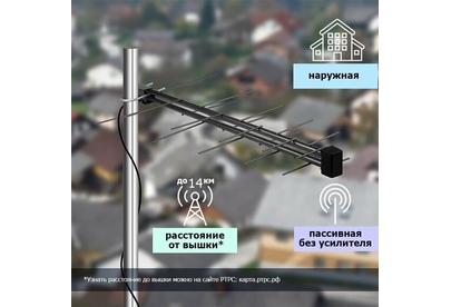 Антенна индивидуальная уличной установки, предназначена для приема цифрового эфирного ТВ вещания в стандарте DVB-T2. Используется для приема цифрового эфирного вещания на телевизорах или комбинированных ресиверах, укомплектованных тюнером стандарта DVB-T2. Характеристики: - Установка антенны: Уличная; - Назначение: для приёма цифрового эфирного ТВ вещания; - Рекомендуемое расстояние до телепередатчика: до 14км; - Коэффициент усиления: 10 дБи; - Волновое сопротивление: 75 Ом; - Усилитель и блок питания: нет; - Размеры в сборе: 670х310х50 мм; - Масса: 0,75 кг - Тип подкл: F- коннектор - Тип упаковки: пакет; - В комплекте: аненна, инструкция по сборке и подключению. Дополнительная информация: Посмотреть зону покрытия цифрового ТВ (DVB-T2), или определить удаленность Базовой Станции (телецентра) от вашего района или населенного пункта можно на официальном сайте РТРС: http: //карта.ртрс.рф