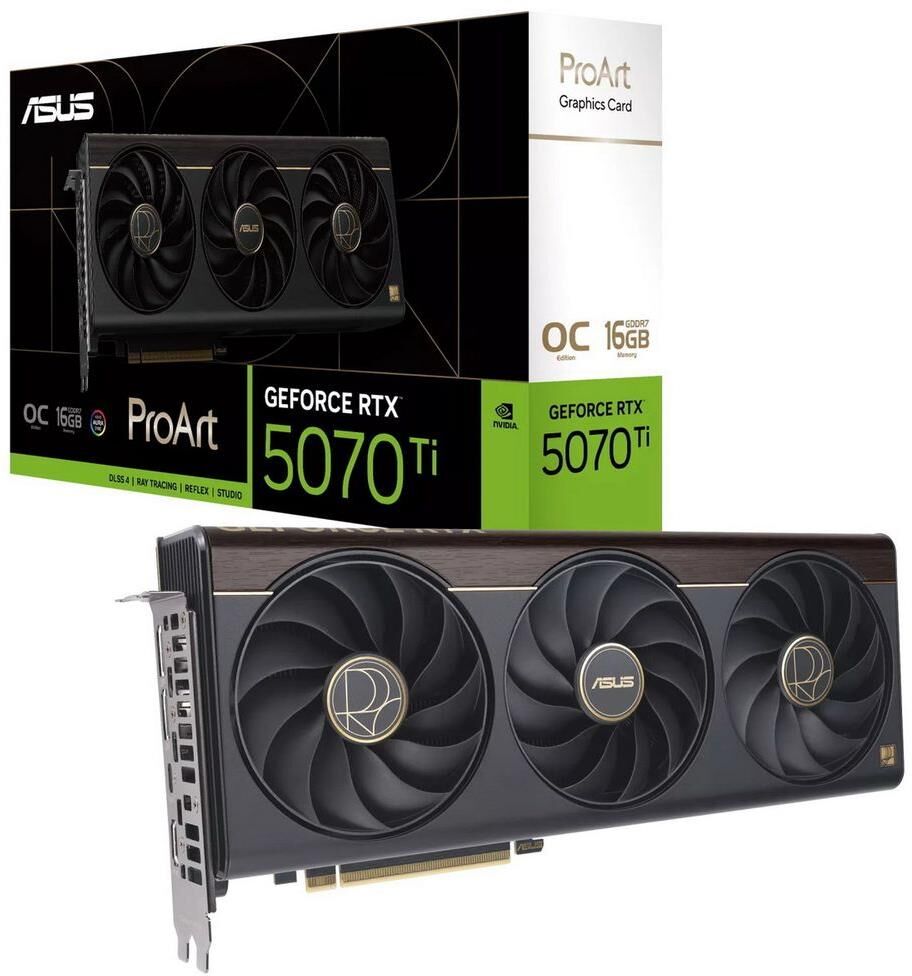 **Видеокарта ASUS RTX5070Ti PROART OC 16GB GDDR7 — мощь и стиль для ваших игр!** Погрузитесь в мир реалистичной графики и плавного геймплея с видеокартой ASUS RTX5070Ti PROART OC. Эта модель создана для настоящих ценителей компьютерных игр и обеспечит вам непревзойдённое качество изображения и высокую производительность. **Почему стоит выбрать ASUS RTX5070Ti PROART OC?** * **Высокая производительность:** графический процессор NVIDIA GeForce RTX 5070 Ti с заводским разгоном гарантирует быструю и стабильную работу даже в самых требовательных играх. * **Большой объём видеопамяти:** 16 ГБ GDDR7 позволяют обрабатывать большие объёмы данных, что особенно важно при работе с высоким разрешением и сложными графическими эффектами. * **Поддержка высокого разрешения:** максимальное разрешение 7680x4320 — вы сможете наслаждаться чёткой и детализированной картинкой. * **Множество возможностей для подключения мониторов:** можно подключить до 4 мониторов одновременно благодаря наличию 2 разъёмов DisplayPort, 1 USB Type-C и 1