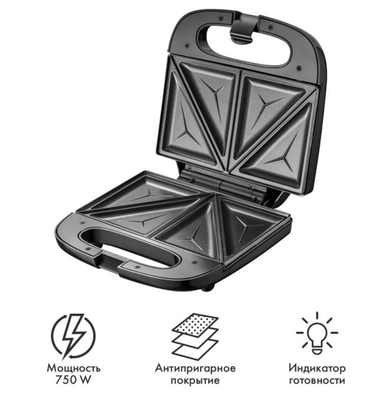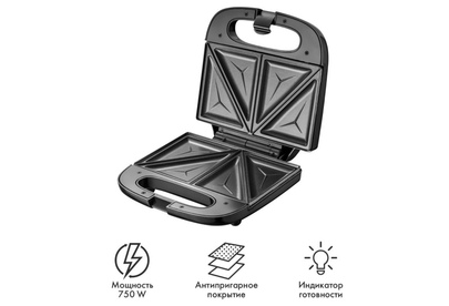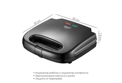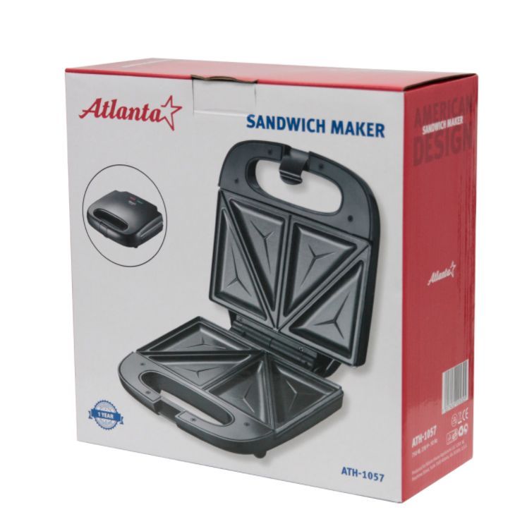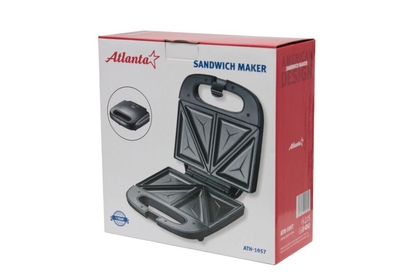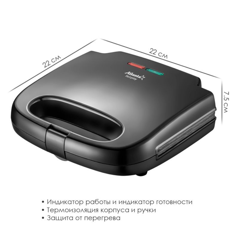 ATLANTA ATH-1057 (BLACK) Антипригарное покрытие, защита от перегр., форма «клаб», удобное хранение, 750 Вт. Быстрый Высокая мощность прибора позволяет в кратчайший срок набрать рабочую температуру и приступить к работе. О готовности сэндвичницы к работе Вы можете судить по специальному индикатору готовности. Антипригарное покрытие Рабочая поверхность сэндвичницы покрыта тефлоном, что гарантирует высокие потребительские свойства изделия и легкую чистку, в большинстве случаев Вам придется только смахнуть крошки. Безопасность Прибор имеет прекрасную термоизоляцию ручки, что убережет Вас от ожогов во время использования, и двойную систему пожаробезопасности, исключающую перегрев и как следствие, самовозгорание прибора.