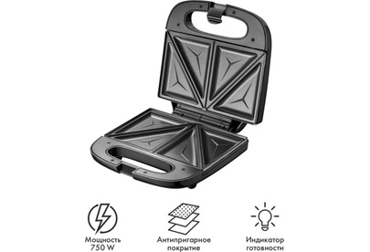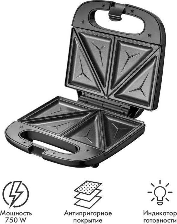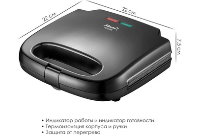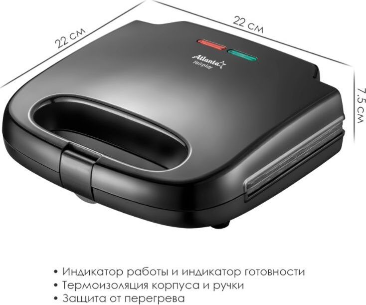 ATLANTA ATH-1057 (BLACK) Антипригарное покрытие, защита от перегр., форма «клаб», удобное хранение, 750 Вт. Быстрый Высокая мощность прибора позволяет в кратчайший срок набрать рабочую температуру и приступить к работе. О готовности сэндвичницы к работе Вы можете судить по специальному индикатору готовности. Антипригарное покрытие Рабочая поверхность сэндвичницы покрыта тефлоном, что гарантирует высокие потребительские свойства изделия и легкую чистку, в большинстве случаев Вам придется только смахнуть крошки. Безопасность Прибор имеет прекрасную термоизоляцию ручки, что убережет Вас от ожогов во время использования, и двойную систему пожаробезопасности, исключающую перегрев и как следствие, самовозгорание прибора.