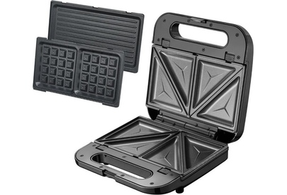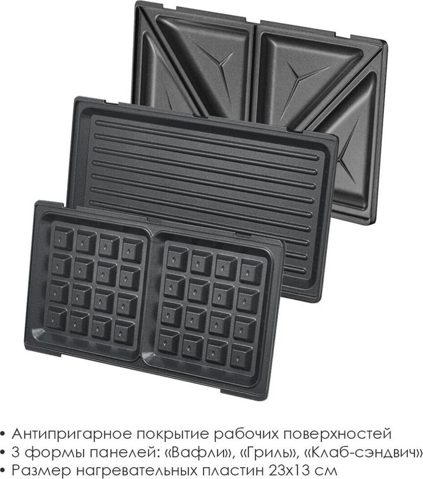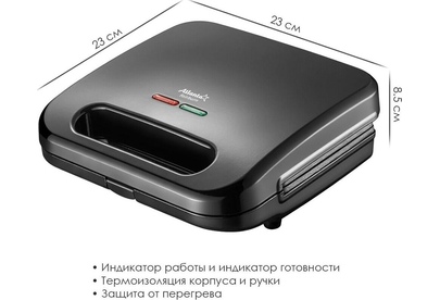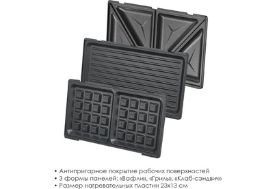 3 вида насадок: сэндвичи, гриль, вафли, антипригарное покрытие, фиксатор, хранение в вертикальном положении, защита от перегрева, световой индикатор работы, световой индикатор готовности использования, дополнительная термоизоляция корпуса