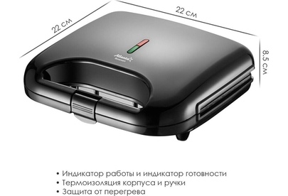 ATLANTA ATH-1078 (BLACK) Антипригарное покрытие Компактное хранение Защита от перегрева Световой индикатор работы Световой индикатор готовности использования Дополнительная термоизоляция корпуса Кабель питания 70см Номинальная мощность 750 Вт 230 B ~ 50 Гц