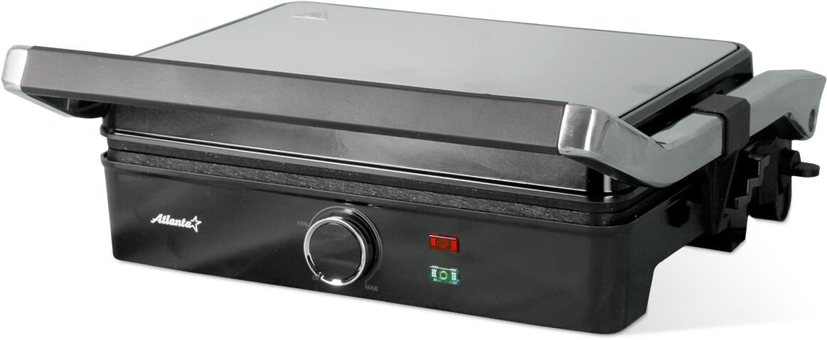 Размер панелей 28,8 X 20,1 см Антипригарное покрытие Открытие панелей на 180° Регулируемый термостат: 140 - 220°С Световой индикатор нагрева Световой индикатор работы Контейнер для сбора масла Корпус из нержавеющей стали и термостойкого пластика Защита от перегрева Мощность 2000 В 230 B ~ 50 Гц