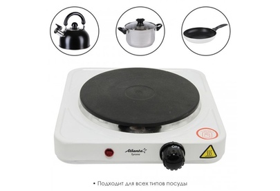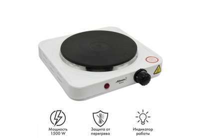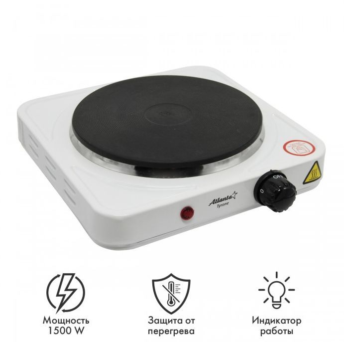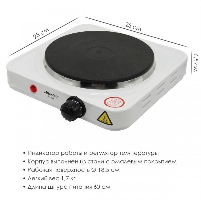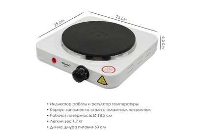 Номинальная мощность 1500 Вт Чугунный ТЭН диаметром 18.5 см Регулятор температуры Индикатор работы Защита от перегрева Кабель питания 60 см 230 B ~ 50 Гц