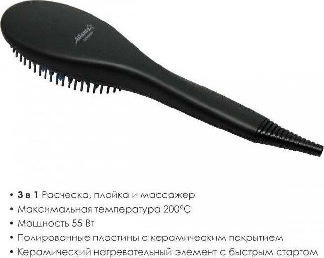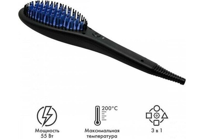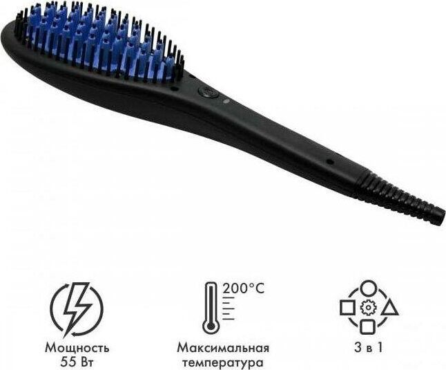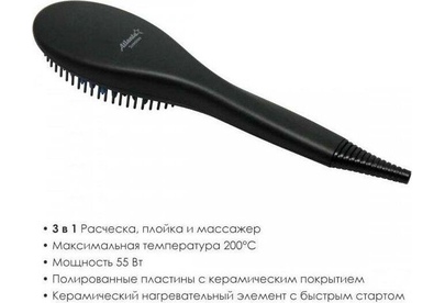 Полированные пластины с керамическим покрытием Расслабляющий массаж головы Керамический нагревательный элемент с быстрым стартом 3в1 Расческа, плойка и массажер Максимальная температура 200 °С Номинальная мощность 55 Вт 230 B ~ 50 Гц