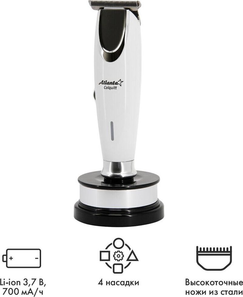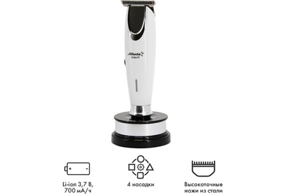 ATLANTA ATH-6912 (BEIGE) Машинка для стрижки аккумуляторная Удобная подставка с зарядкой Питание от аккумулятора и через адаптер Регулируемая насадка: 0.3-3,3 мм Функция филировки Дополнительные аксессуары в комплекте Индикатор зарядки Прецизионные ножи из стали высокой прочности Долговечный, мощный аккумулятор Li-ion 3,7; 600 мА/ч