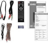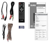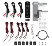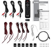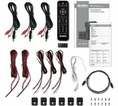Колонки (4 шт в комплекте). 5 динамиков всего. Выходная мощность: 69 Вт. Bluetooth 5.0. В комплекте: колоночный кабель 3шт., RCA аудио кабель, 3.5мм аудио кабель, пульт ДУ, инструкция пользователя.