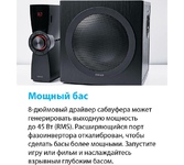Мощность центральной колонки: 60. Суммарная звуковая мощность: 60. Основной цвет: черный. Акустический тип: 2.1. Стерео-вход AUX INPUT: есть. Общий вес: 3.7. Отношение сигнал/шум: 85. Тип электропитания: от сети/от аккумулятора. Размеры ВЧ динамика (фронт): 31.75. Количество ВЧ динамиков (фронт): 2. Количество СЧ динамиков (фронт): 1. Размеры СЧ динамика (фронт): 101.6. Расположение регуляторов: на верхней панели. Особенности: Совместимо с мобильным приложением EDIFIER Home. Разъем USB: 1. Материал корпуса центральной колонки: MDF. Тип беспроводного подключения: Bluetooth. Габариты упаковки (ед) ДхШхВ: 0.34x0.227x0.26. Вес упаковки (ед): 5.06. Гарантия: 12 мес.. Частотный диапазон: 50 Гц - 60 КГц. Размер центральной колонки (ШхВхГ): 277 х 165 х 165 мм. Питание: от сети/от аккумулятора. Цвет: черный. Тип: 2.1; Bluetooth. Регуляторы: на верхней панели. Суммарная звуковая мощность: 60 Вт