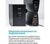 Акустическая система, выходная мощность (RMS), Вт 50 (2 х25), частотный диапазон, Гц 45 – 27 000, диаметр ВЧ-динамиков, мм O 25, диаметр НЧ-динамиков, мм O 100, напряжение питания ~220 В, 50 Гц, материал корпуса - дерево (MDF), беспроводная передача сигнала по Bluetooth, высококачественные купольные ВЧ-динамики, воспроизведение музыки с USB flash и SD card памяти, встроенное FM-радио, пульт ДУ, размеры изделия, мм - 145 х285 х218.