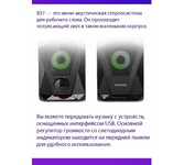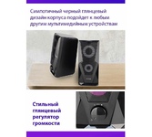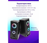 Акустическая система, суммарная выходная мощность (RMS) 6 Вт, мощность сателлитов (RMS) 2х3 Вт, размер динамиков сателлитов 2х2,5", диапазон частот 270–200000 Гц, разъем для наушников, вход для микрофона, тип интерфейса 3,5-мм джек, питание от USB, 5 В.