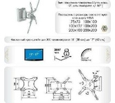 Для использования с телевизорами диагональю 13"-43", весом до 45кг. Расстояние телевизора от стены 22мм. VESA 50x50, 75x75, 100x100, 100x150, 150x100, 100x200, 200x100, 150x150, 200x200. Возможен наклон на 8 градусов.