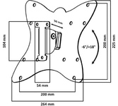 Наклонный Диагональ: 10"-55" (25-139см) Расстояние от стены: 50 мм Угол наклона: -6°/+18° Нагрузка: 25 кг Толщина металла адаптера 1,5 мм, основания 2 мм. Регулировка угла наклона без использования инструмента. Vesa 200*200.