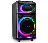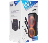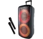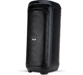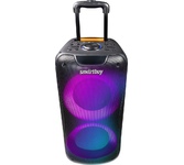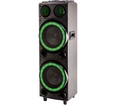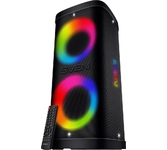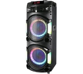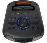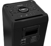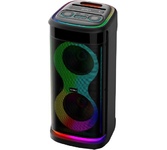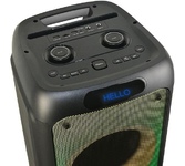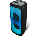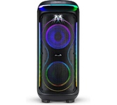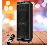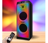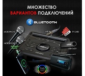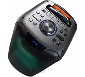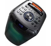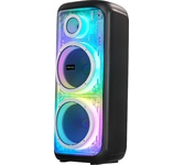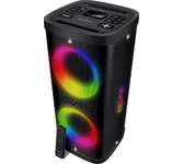 Мидисистема с Bluetooth, Максимальная мощность: 1000 Вт, RMS: 150 Вт, Корпус из МДФ, 7 цветная RGB подсветка, Микрофон проводной в комплекте, Воспроизведение музыкальных файлов в формате MP3/WMA/FLAC/WAV/APE/AAC, FM тюнер, TWS функция, Полнофункциональный пульт дистанционного управления, Функция караоке, 2 входа для подключения микрофона, Регулировка низких и высоких частот, Эхо-эффект канала микрофона, USB разъем, TF разъем, Двухканальный линейный вход, Питание: ~100 - 240 В, 50-60 Гц, Встроенный аккумулятор:12 Вольт, 7000 мАч