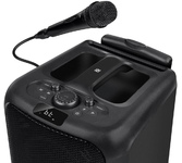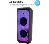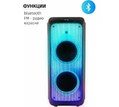 акустическая колонка 2*12 динамика 1*5 повторителя, Режимы: - Bluetooth, - Внешний накопитель , - Aux, - FM, Мощность: - 800 Ватт PMPO , -80 Ватт RMS, Питание: - Сеть 220V , - Встроенный аккумулятор 7000 mAh (до 5 часов работы), Разъемы: - USB , - SD, MicroSD, - Jack 6.3 мм (микрофон, гитара) 2 шт., - Audio input, 2х канальный, Микрофон беcпроводной 2 ш., Пульт Д/У, Кабель питания 220V, Кабель подключения 12V , Размер: 39х80х36 см, TWS функция соединения двух колонок в акустическую систему через Bluetooth, Дисплей, Кнопка вкл/выкл подсветки , Индикатор заряда батареи, Регулировка звучания микрофонов, LED посветка динамика (активная) , Эквалайзер, Телескопическая ручка для перемещения , Колесики, Возможность подключения дополнительного аккумулятора 12V, Возможность записи звука, Кнопка приоритета микрофона