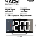 Светодиодный дисплей с высотой символов 3" (7.62 см) Плавная регулировка яркости дисплея Кварцевый стабилизатор Два будильника Два режима работы будильника (сигнал/радио) Отложенный сигнал будильника Отключение радио по таймеру Формат времени 12/24 часа FM-тюнер (87.5 – 108 МГц) Встроенный динамик Два USB-порта для зарядки мобильных устройств (5 В 1 А) Питание от адаптера (в комплекте) Индикация: зеленая Цвет: чёрный