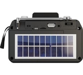 Диапазоны частот: FM/AM/SW Bluetooth 5.3 Поддержка аудионосителей: USB/microSD Аудиовход AUX-in Выходная мощность: 5 Вт Воспроизведение форматов MP3, WAV, WMA, FLAC, APE Батарея: 1200 мАч Солнечная батарея Фонарик Телескопическая поворотная антенна Разъём 5 B для зарядки (microUSB)