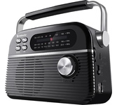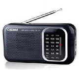 Портативный трёхдиапазонный радиоприемник FM / AM / SW, функция MP3-плеера (читает файлы с microSD/SD/USB носителей), антенна телескопическая 360°, питание встроенный аккумулятор / батарейки 2 x R20 / сеть 220 В, выходы 3,5 мм (на наушники), устройство снабжено встроенным фонарём повышенной яркости