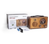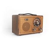 Тюнер аналоговый, УКВ/СВ/КВ диапазоны (УКВ 64-108МГц СВ 520-1620КГц КВ 5,9-18,0МГц), 2 динамика (стереозвук) мощностью Ф76mm/4Ом/3W*2шт, питание 220В, батарейки R20*4шт (не в компл.), аккумулятор 1400мА/ч, размер 275*130*185мм, возможность воспроизведения с USB, SD, microSD (TF), AUX, разъем для внешнего питания 6В, телескопическая антенна, функция записи, ручка для переноски.
