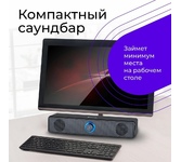 Компактный саундбар с нескользящими ножками под монитор вашего ПК. Регулятор громкости с приятной подсветкой удобно расположен на передней панели.