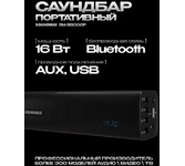 ПОРТАТИВНЫЙ САУНДБАР Выходная мощность: 16 Вт LED дисплей Bluetooth 5.3 Поддержка аудионосителей: USB/microSD Аудиовход AUX-in Воспроизведение формата MP3 FM-радио Функция True Wireless Stereo Hands free Встроенная батарея: 1800 мАч Время работы от аккумулятора: до 8 часов* Цвет: чёрный