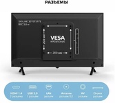 32" (81см) , HD READY 1366x768, SMART TV AOSP 9.0 1RAM + 8Gb ROM bluetooth / voice control remote ,цифровой тюнер DVB-T2/DVB-C,(.H.264/MPEG4/2/1/VC1) ,Запись ТВ программ , Электронный Телегид, Отложенный просмотр; слот CI+ для модуля условного доступа, формат экрана: 16: 9, Авто динамическая контрастность: 70000: 1 , яркость: 230 кд/м2, угол обзора (Г/В): 178°/178°, время отклика: 8 мс, Частота обновления экрана - 50Гц, 3D цифровой фильтр, русское, английское меню, телетекст, аудио: 2х6 Вт, входы: антенный ,разъемы для подключения: USB, 2 HDMI, копмозитный AV, компонентный YPbPr, VGA, HDMI,ПК аудио,SCART вход,SPDIF, вход для наушников, вход CI+ (common interface), вход для антенны