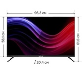 Диагональ: 40” (102 см), Разрешение экрана: 1920 (Г) x 1080 (В), Яркость: 220 кд/м2 , Динамическая контрастность: 100000:1, Угол обзора (Г/В): 178°/178°, 16,7 миллионов цветов, Время отклика: 8 мс, Цифровой тюнер: DVB-T2/DVB-C, Поддерживаемые системы цветности: PAL/SECAM, Поддерживаемые системы звука: BG/DK/I, Размеры 892x510x73 мм, VESA 200x200мм, Питание ~100-240 В, 50/60 Гц, Формат экрана: 16:9, Формат изображения: 16:9; 4:3; Авто, Выходная мощность: 2 х 10 Вт, Смарт ТВ, Операционная система: Android 14.0, Процессор: CA55 quad core, DDR: 1GB, Flash: 8GB, WI-FI, Выход в сеть через Ethernet (RJ45), Разъемы для подключения: Аудио/видео вход, 2 USB входа, 3 HDMI входа, CI слот для модуля условного доступа, Вход для антенны, Выход для наушников, LAN (RJ45)